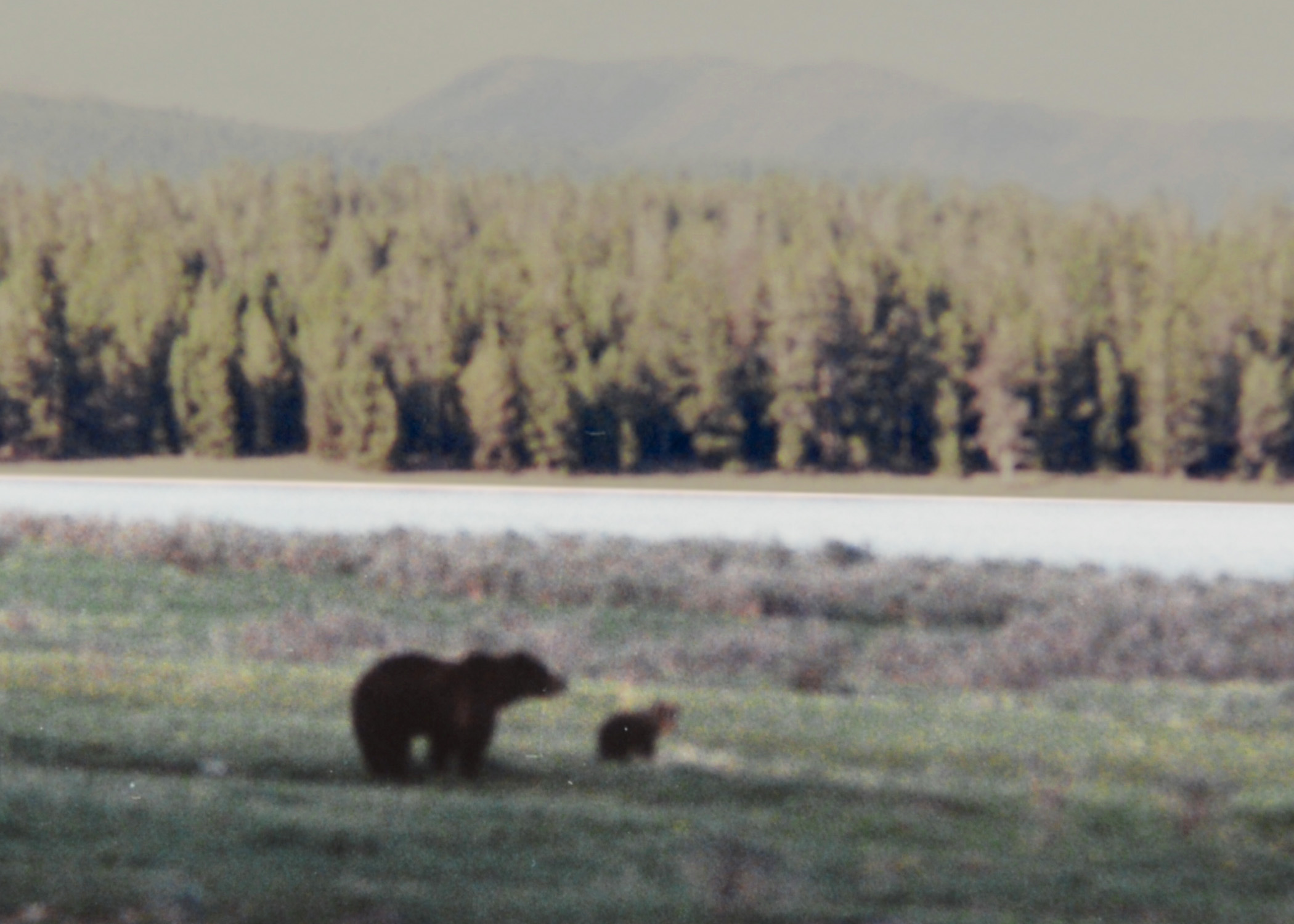 I saw my first grizzly bear in 1989 in Yellowstone National Park. Fresh from graduating with a B.S. Degree in Aerospace Engineering from The University of Texas, I was taking one last family vacation before fulfilling my responsibilities designing military aircraft at General Dynamics. We were staying at the Yellowstone Hotel on the shores of Lake Yellowstone, and heard rumors that a mother grizzly bear was feeding on spawning cutthroat trout in a stream near the hotel. We went out to inspect, and sure enough, there stood a mother grizzly bear about 100 yards in the distance. A Yellowstone Ranger had the formidable task of keeping about 100 tourists behind an imaginary line he had drawn. With a Nikon N70 35 mm camera and 300 mm zoom, I hoped to grab a few photos of the bear. The light levels were a bit low for my lens, but I did manage to at least capture the bear and one of her two cubs on film.